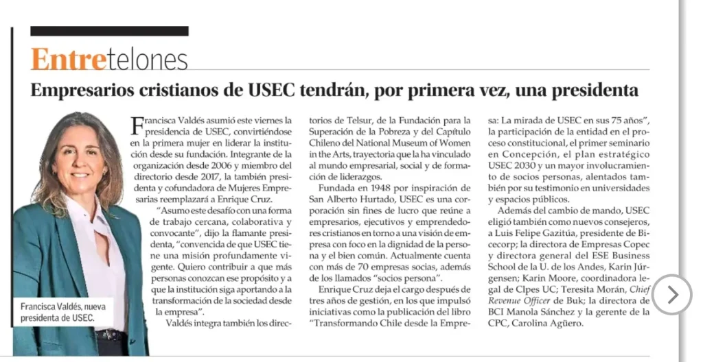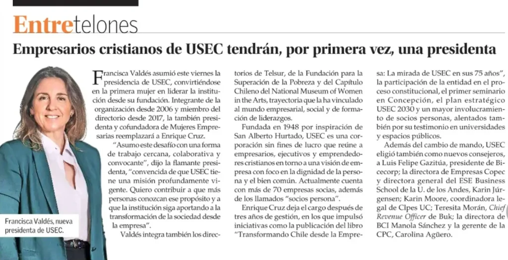 Por primera vez desde su fundación, la Unión Social de Empresarios y Ejecutivos Cristianos (USEC) tendrá una mujer en la presidencia. Se trata de Francisca Valdés, quien asumió el cargo este viernes, marcando un hito en la historia de la organización.